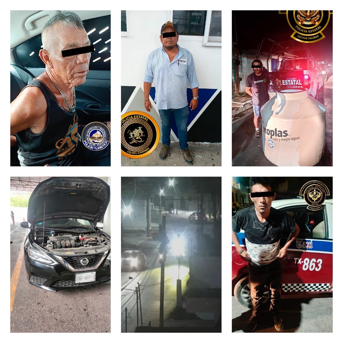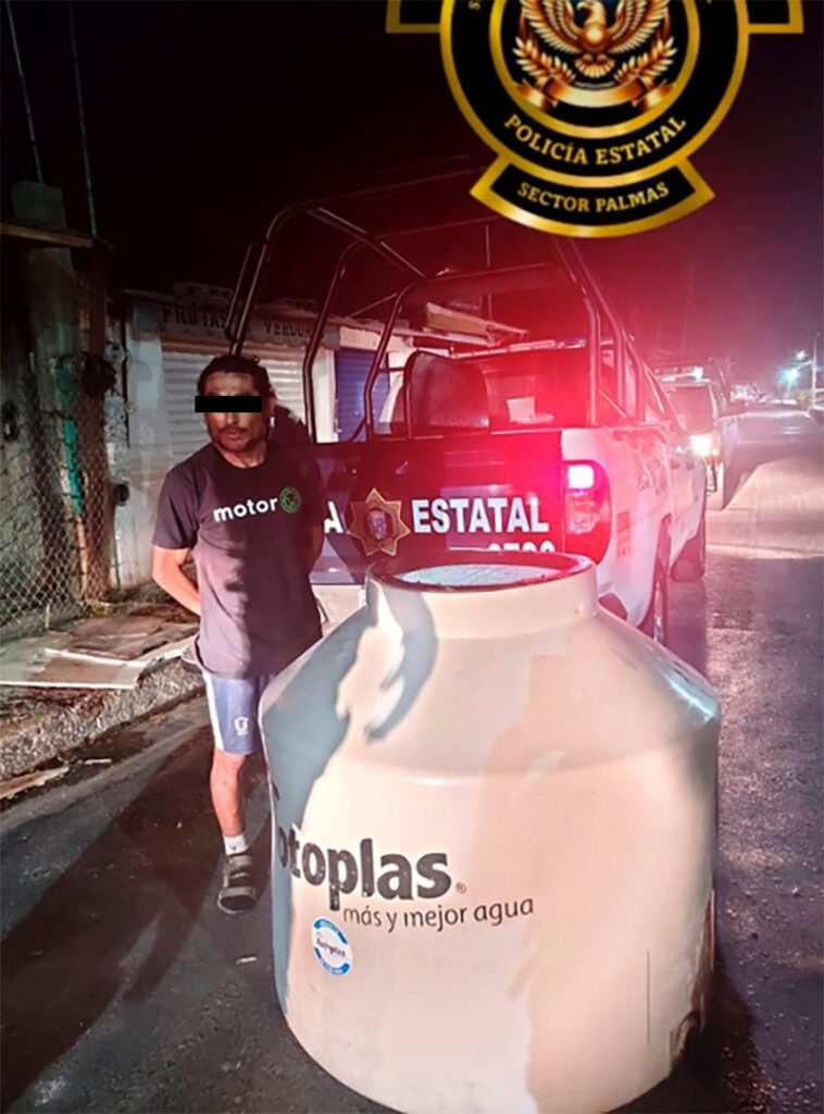 En el patrullaje por la colonia Minas, los agentes de la SPSC observaron a una persona que cargaba un tinaco del que no pudo comprobar su legal procedencia, fue detenido y puesto a disposición de la FGE. Asimismo, en el módulo de verificación REPUVE se detectó un vehículo Nissan con placas falsas de Yucatán, el cual tenía el número de serie esmerilado, al obtener el número real y consultarlo, resultó con reporte de robo en Ciudad de México.