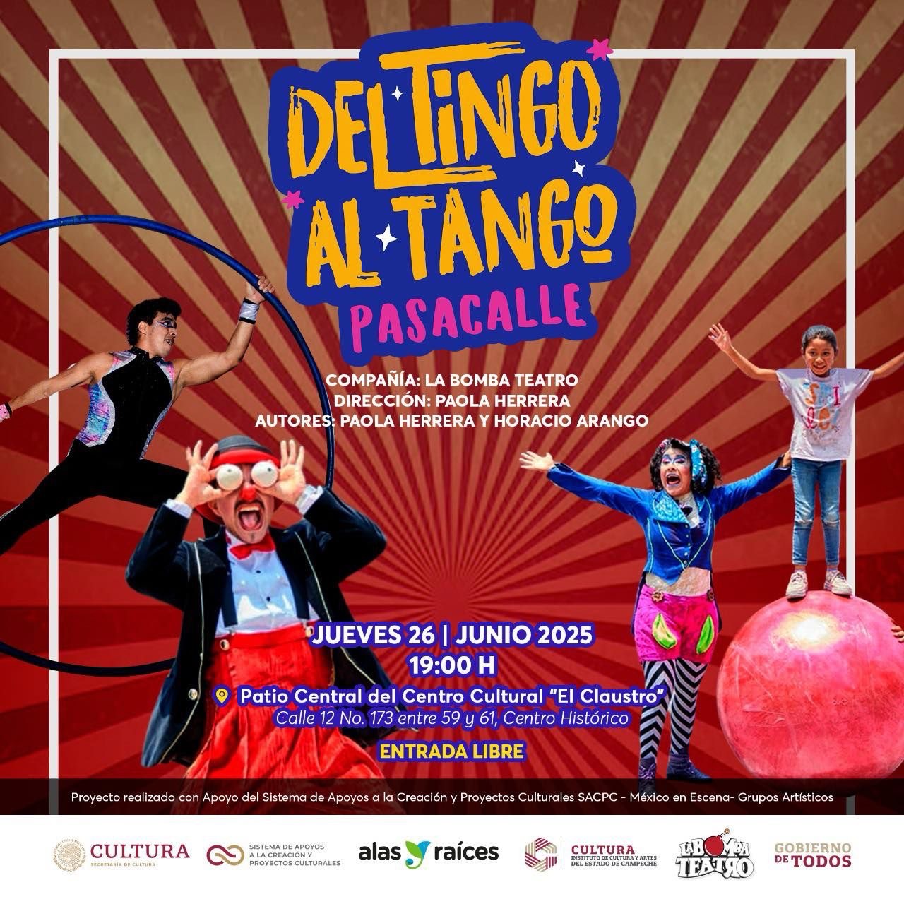 El Espectáculo teatral “Del Tingo al Tango Pasacalle”, bajo la dirección de Paola Herrera, se presentará el próximo 26 de junio de 2025 en el patio del Centro Cultural “El Claustro” del Instituto de Cultura y Artes del Estado de Campeche.