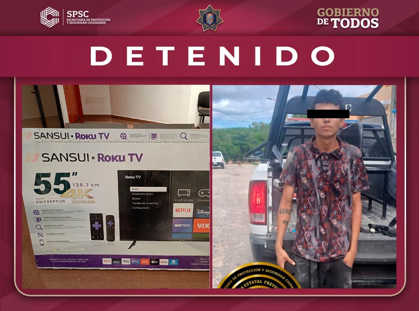 Mediante las cámaras de videovigilancia del C5, se logró ubicar al sujeto que coincidía con las características proporcionadas por la reportante, y que se encontraba en posesión de un televisor, por lo que se procedió a su detención.