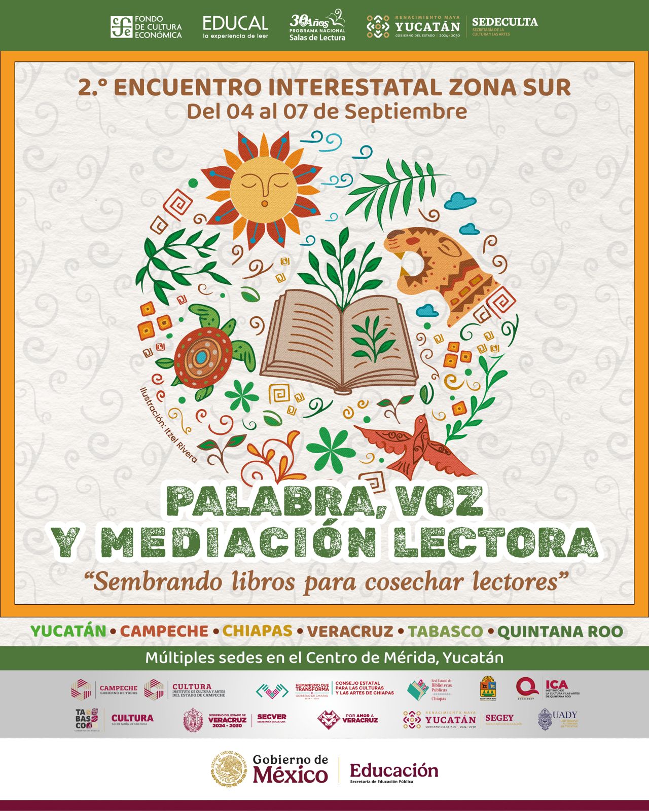 Veinte mediadores de lectura de Campeche representarán al estado en el Segundo Encuentro Interestatal de la Zona Sur: “Palabra, voz y mediación lectora”, que se realizará del 4 al 7 de septiembre en Mérida, Yucatán, coorganizado por el Programa Nacional de Salas de Lectura (PNSL), la Secretaría de la Cultura y las Artes del Gobierno de Yucatán y el Fondo de Cultura Económica (FCE).
