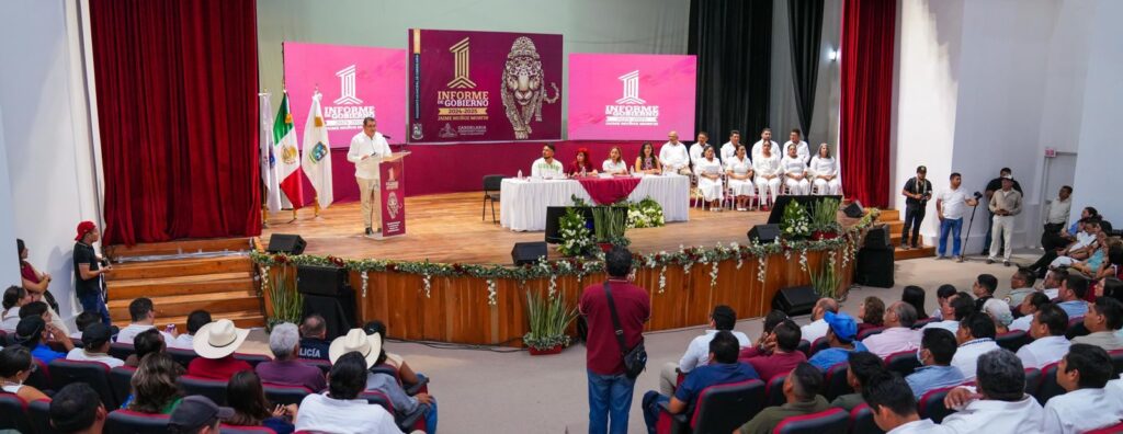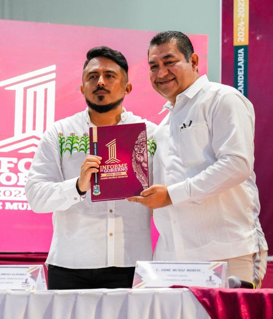 En un acto solemne celebrado en el teatro “Aurora López de Cambranis”, la Gobernadora, Layda Sansores San Román, acompañó al presidente municipal de Candelaria, Jaime Muñoz Morfín, en la rendición de su Primer Informe de Actividades, correspondiente al periodo 2024-2025.
