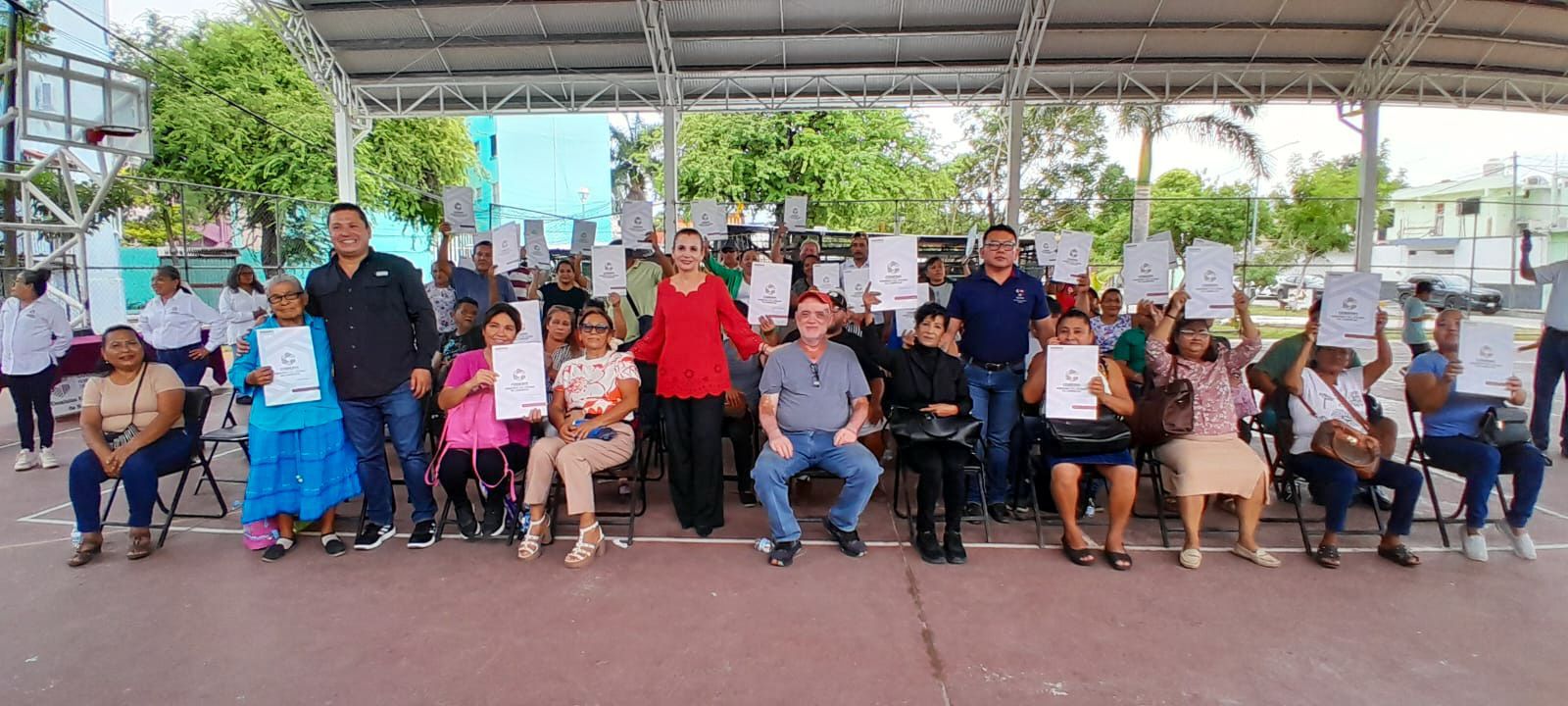 En representación de la secretaria de Gobierno, Liz Hernández Romero, el subsecretario de Gobierno en Carmen, César Marín Reyes, encabezó el acto celebrado en la cancha techada de Usos Múltiples de la colonia Tecolutla, acompañado por la directora general de la Comisión Estatal de Desarrollo de Suelo y Vivienda (Codesvi), Elvira de la Peña Abreu, y el director de Asuntos Agrarios de la Secretaría de Gobierno, Martín Uicab Kuc.