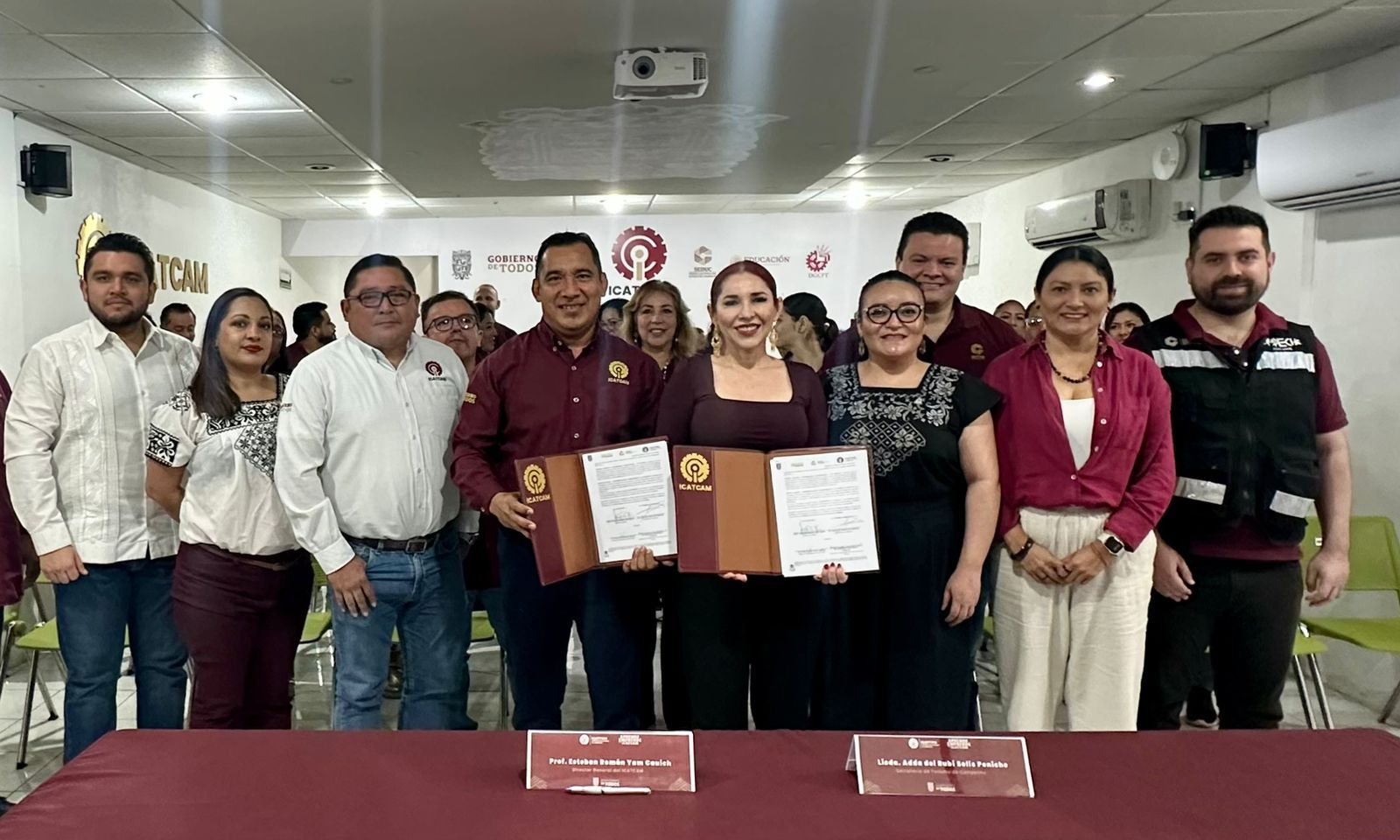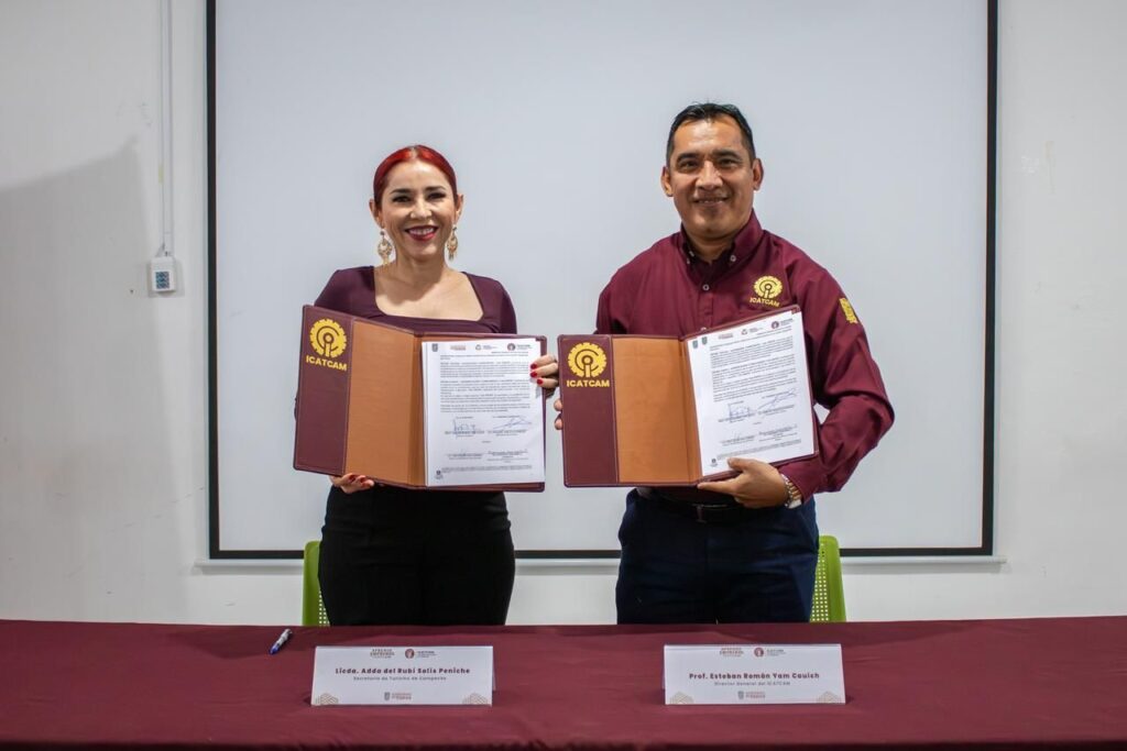 La firma del acuerdo estuvo encabezada por la Secretaria de Turismo, Adda Solís Peniche, y el Director General del ICATCAM, Esteban Yam, quienes coincidieron en que la capacitación continua de los prestadores de servicios turísticos y del personal del sector es una herramienta clave para fortalecer la competitividad del destino.